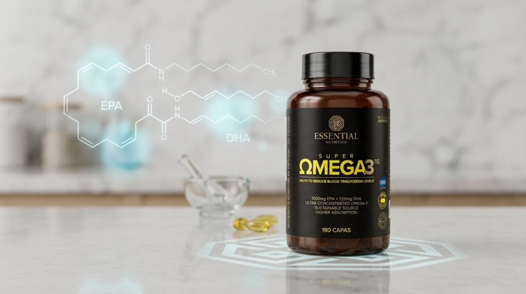 Análise completa do Super Ômega 3 TG – Essential Nutrition. Descubra os benefícios, a pureza do selo IFOS, a tecnologia rTG e se realmente vale o investimento.